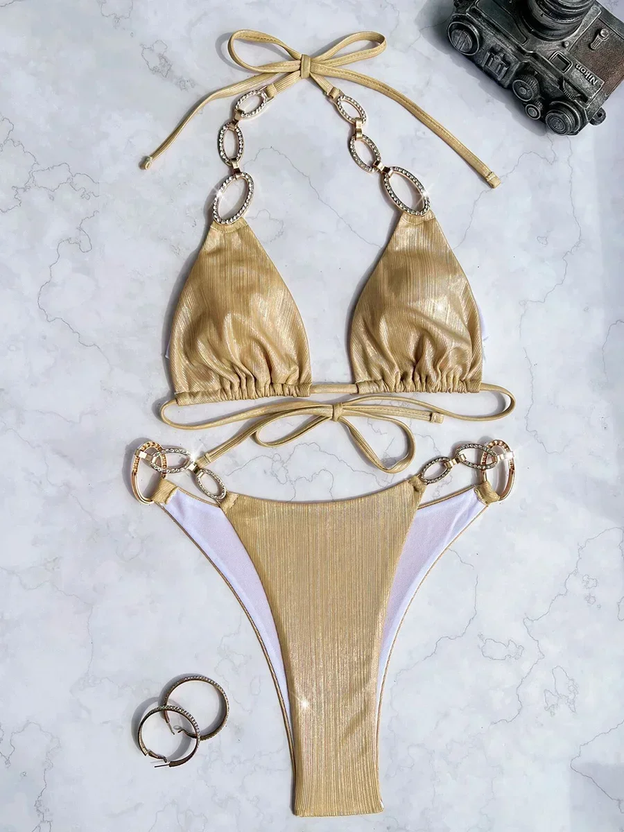 Préparez-vous à attirer tous les regards cet été avec le Bikini 2 Pièces Brillant Avec Chaînes Métal de Gaine Style, un maillot audacieux et glamour qui met en valeur votre silhouette et exprime votre personnalité avec élégance.